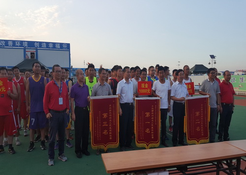 建設單位指揮部史副指揮長、工程部趙部長、監理中企建發公司隋總為獲得冠軍、亞軍、季軍的籃球隊頒獎